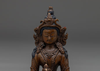 This Handcrafted Amitayus Buddha Sculpture beautifully embodies the Buddha of Infinite Life, revered for bestowing blessings of health, vitality, and compassionate energy. Measuring 12 cm wide and weighing 0.73 kg, this finely detailed sculpture depicts Amitayus seated in tranquil meditation, gently holding the vase of immortality—a potent symbol of life’s sacred energy and spiritual abundance. Crafted from oxidized copper, the statue’s serene expression and meditative posture invite a deep sense of calm and reflection, making it an ideal centerpiece for home altars, meditation spaces, or sacred corners. Beyond its decorative appeal, this sculpture serves as a meaningful spiritual gift, inspiring longevity, inner peace, and compassionate living for those who seek to cultivate these qualities in their daily practice and life.