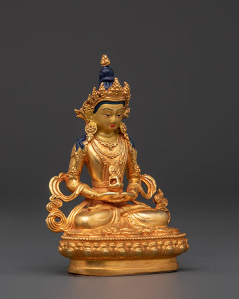 Bring serenity and prosperity into your house with our handcrafted Amitayus Buddha statue, which symbolizes longevity and well-being. This magnificent statue is skillfully crafted, highlighting the peaceful face and delicate features of Amitayus, the Buddha of Long Life. The statue's beautiful golden tone is matched by its copper base, making it a stunning addition to any meditation or spiritual setting.