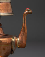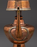 These Bumpa pots are crafted from polished copper and adorned with intricate white metal decorations, seamlessly blending style and functionality. While the elegantly carved spouts evoke the sacred bird's symbolism, sometimes linked with Garuda or Hamsa, the upper lids are adorned with ceremonial horn-like finials. Functionality, history, and spiritual symbolism are all harmoniously balanced in this set, whether it is used in everyday routines or displayed in a sacred area.