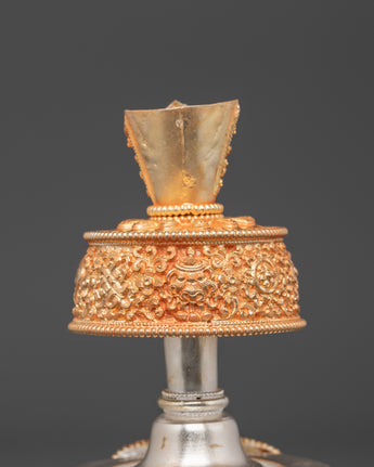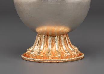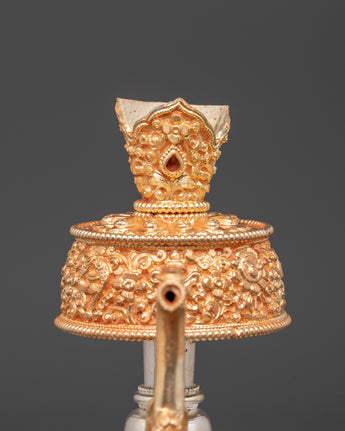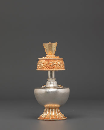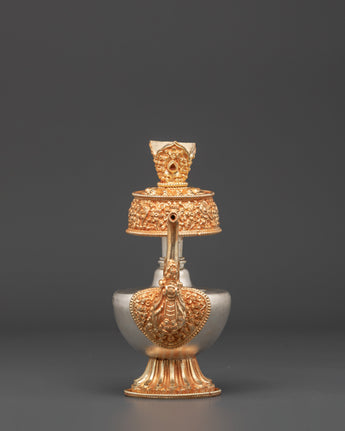 Enhance your spiritual atmosphere with this Gold and Silver Plated Bhumba, a delicate ritual vessel carved from copper. This ceremonial ritual Kalash, which measures 18.5cm in height by 12cm in breadth and weighs 0.46kg, is excellent for Buddhist and Hindu religious events. The meticulous craftsmanship is enhanced with bright gold and silver plating, which represents purity, prosperity, and spiritual enlightenment. This precious Bhumba pot holds holy water during rituals and is a must-have for every altar or temple.