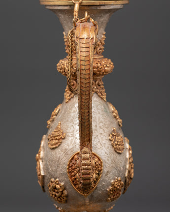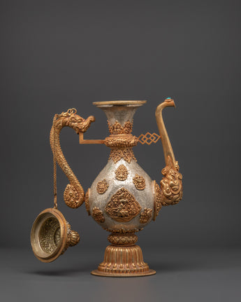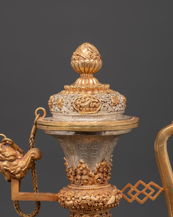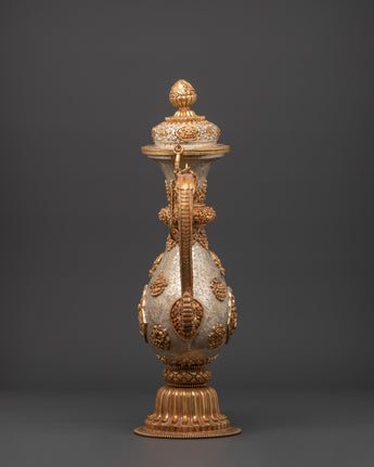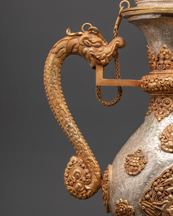 The vase is made of copper and plated with beautiful gold and silver. It features intricate, detailed motifs, including a dragon handle that represents strength and protection. Standing 46 cm tall and 27 cm wide, it is a substantial yet elegant piece that is highly valued in Tibetan rituals. The gilded finish emphasizes the fine craftsmanship, with each curve and decoration intended to evoke both beauty and spiritual power, making this vase a focal point for your sacred space.