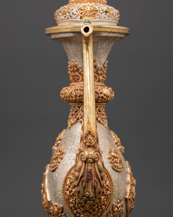 This Handcrafted Tibetan Bhumba Vase, whether used for water offerings, rituals, or displayed on your Buddhist altar, serves as a visual and spiritual centerpiece. Its gold and silver plating, combined with the traditional Tibetan dragon motif, make it a meaningful object of respect. This vessel will enhance your spiritual practice and attract abundance, protection, and positive energy to your home or place of worship.