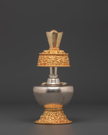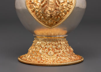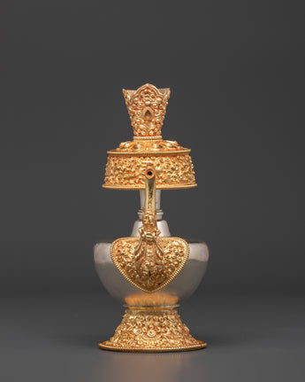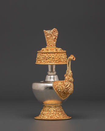 Meticulously crafted, the Tibetan Ritual Bhumba exemplifies traditional Tibetan artistry. Skilled artisans employ time-honored techniques to shape the copper, then apply gold and silver plating. Hand-carved decorative details, like intricate golden motifs on the base, spout, and lid, highlight the artisan’s dedication. Its ornate features hold spiritual significance in Tibetan rituals, where it is used to contain sacred offerings or liquids. This piece functions both as a ritual vessel and a symbolic artifact, embodying the deep spirituality and cultural richness of Tibetan Buddhism.