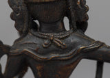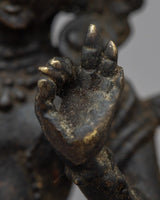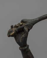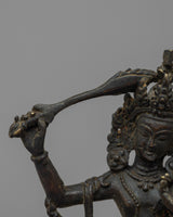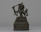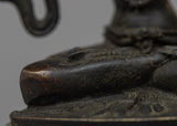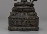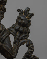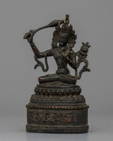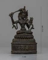 This handcrafted Black Manjushri Statue features a brass body with an antique finish, giving it an aged and distinguished appearance. Manjushri is a revered bodhisattva associated with wisdom and enlightenment in the Buddhist tradition. The statue depicts Manjushri in a black color, symbolizing deep wisdom and insight. The intricate craftsmanship highlights the details of the statue, showcasing the serene expression and noble posture of Manjushri. This Black Manjushri Statue serves as a meaningful and beautiful representation of wisdom and can be a source of inspiration for those seeking knowledge, clarity, and spiritual growth.
