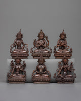 In Buddhism, bodhisattvas are respected as enlightened beings who have postponed their own nirvana in order to help others on their path to enlightenment. The six figures in this set represent different aspects of Buddhist teachings and values: Green Tara represents protection and compassion, White Tara represents longevity and healing, Vajrasattva represents purification, Manjushri represents transcendent wisdom, Chenrezig represents the Buddha's compassion, and Amitayus represents infinite life. Having this set represents embracing these ideas and incorporating them into your daily life.