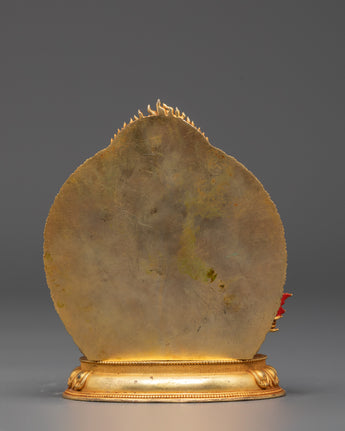 The Bodhisattva Deity Guhyasamaja with His Consort Statue is a potent emblem of wisdom, compassion, and spiritual harmony. This finely sculpted statue, 13cm tall and 10cm wide, is constructed of copper and gold-plated to enhance its holy aura. Guhyasamaja, the embodiment of profound insight and compassion, is shown in a harmonious stance with his spouse, symbolizing the marriage of wisdom and skilled ways. The delicate decorations and golden finish enhance the deity's sacred character, making it a must-have for any altar or meditation room.