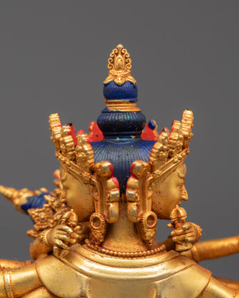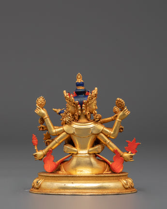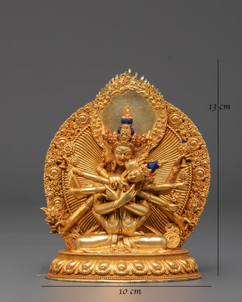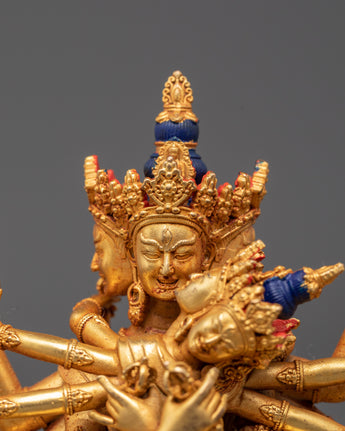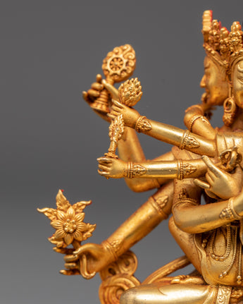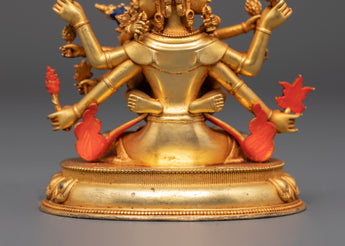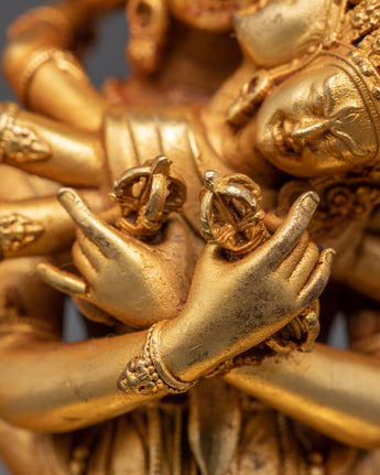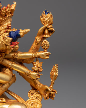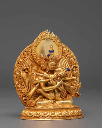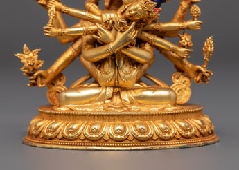 Guhyasamaja, which means "Secret Assembly," is an important figure in Tantric Buddhism. He symbolizes the underlying truths of Buddhist teachings by representing the synthesis of form and emptiness. With many arms and embracing a consort, his complex iconography depicts the union of wisdom and method, a major element in Vajrayana practice. Guhyasamaja's profound essence is captured in this statue, which serves as an embodiment of spiritual knowledge and transformation.
