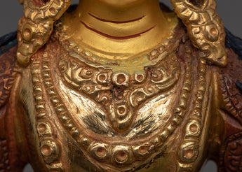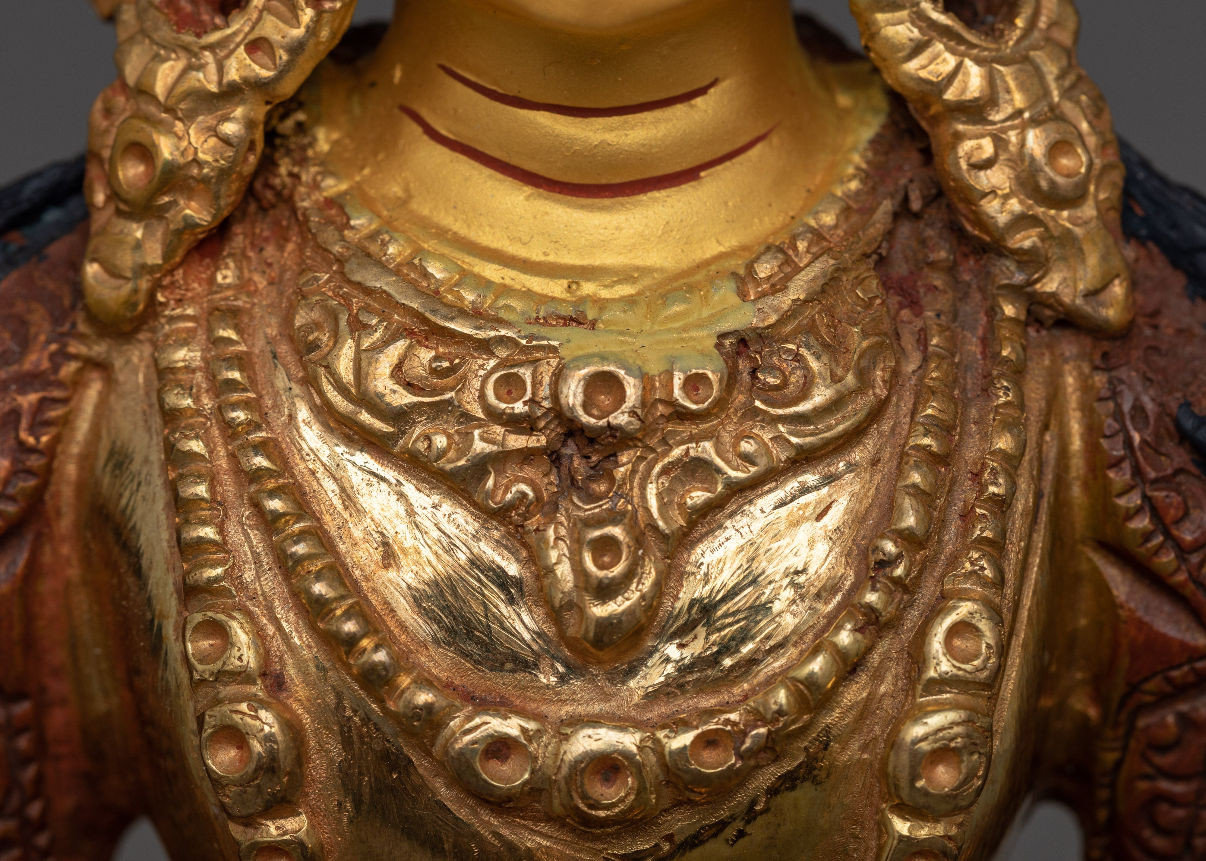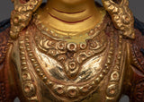 Admire the lovely Buddha Amitayus Oxidized statue, carefully created by Nepali artisans in Patan. This 8.3-inch-tall statue, with a 5.9-inch base, is made of oxidized copper and is embellished with elaborate acrylic paintings and 24K gold plating. The sculpture of Buddha Amitayus, also referred to as the Buddha of Infinite Life in Mahayana Buddhism, is calm and carefully crafted, representing wisdom and longevity.