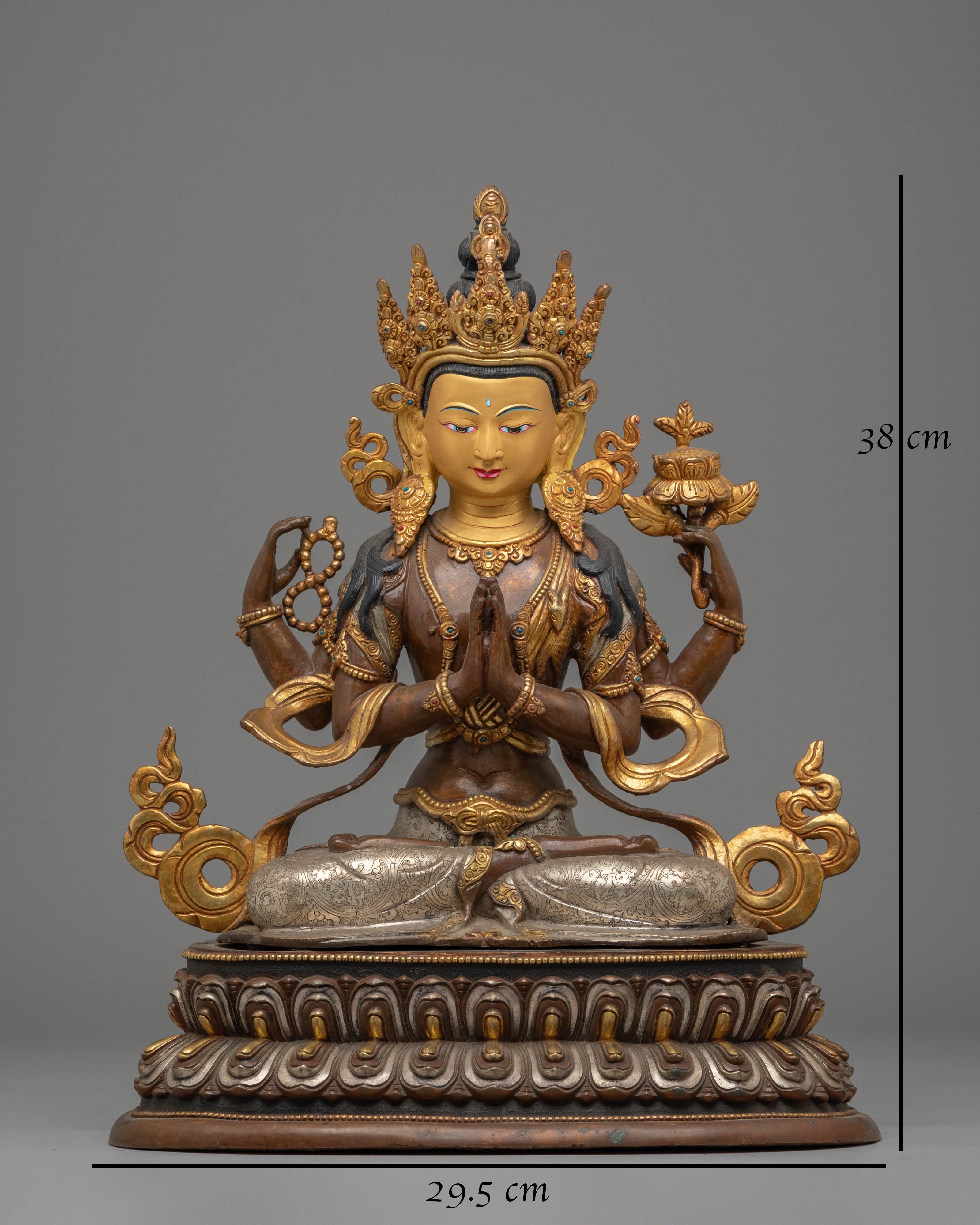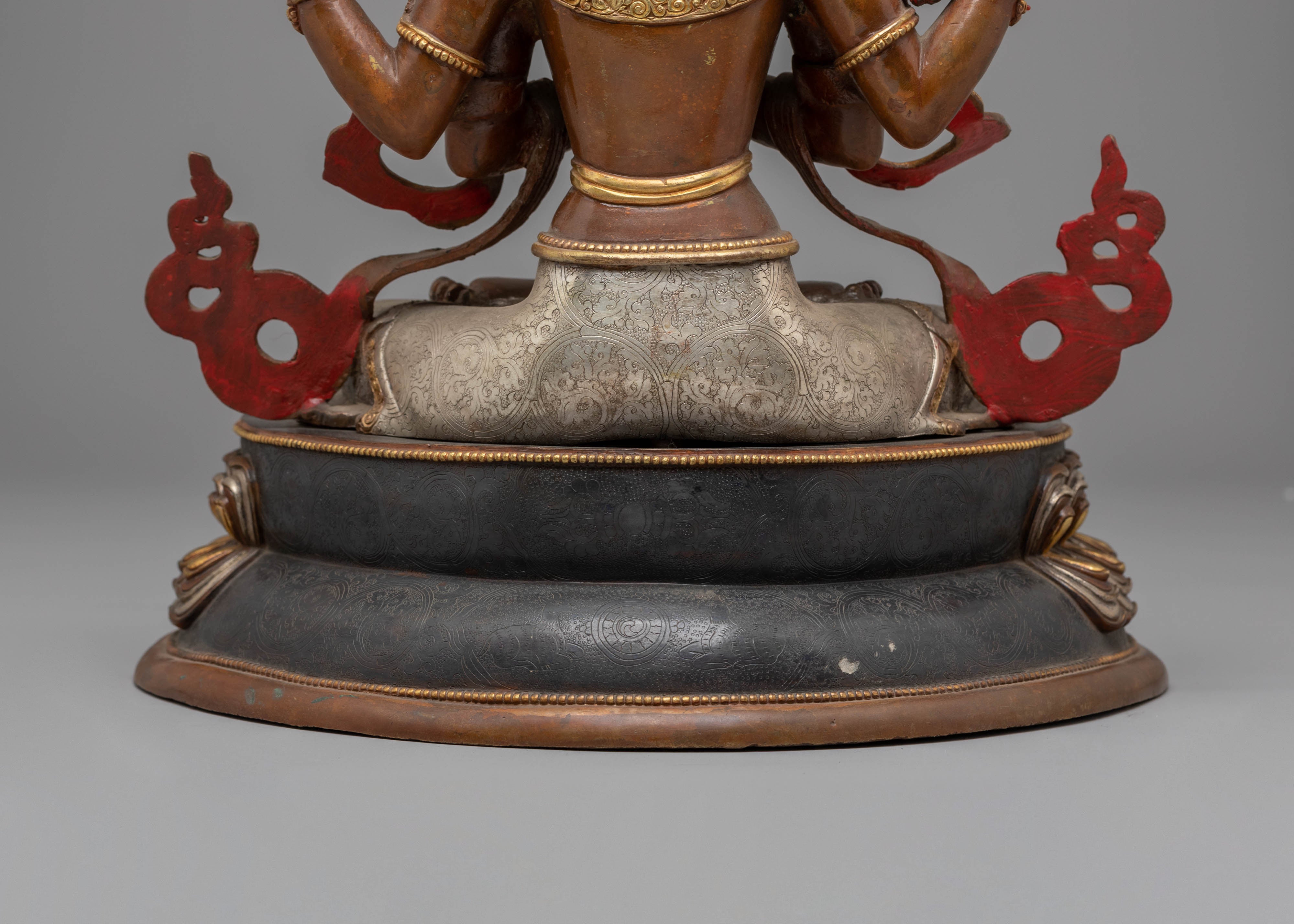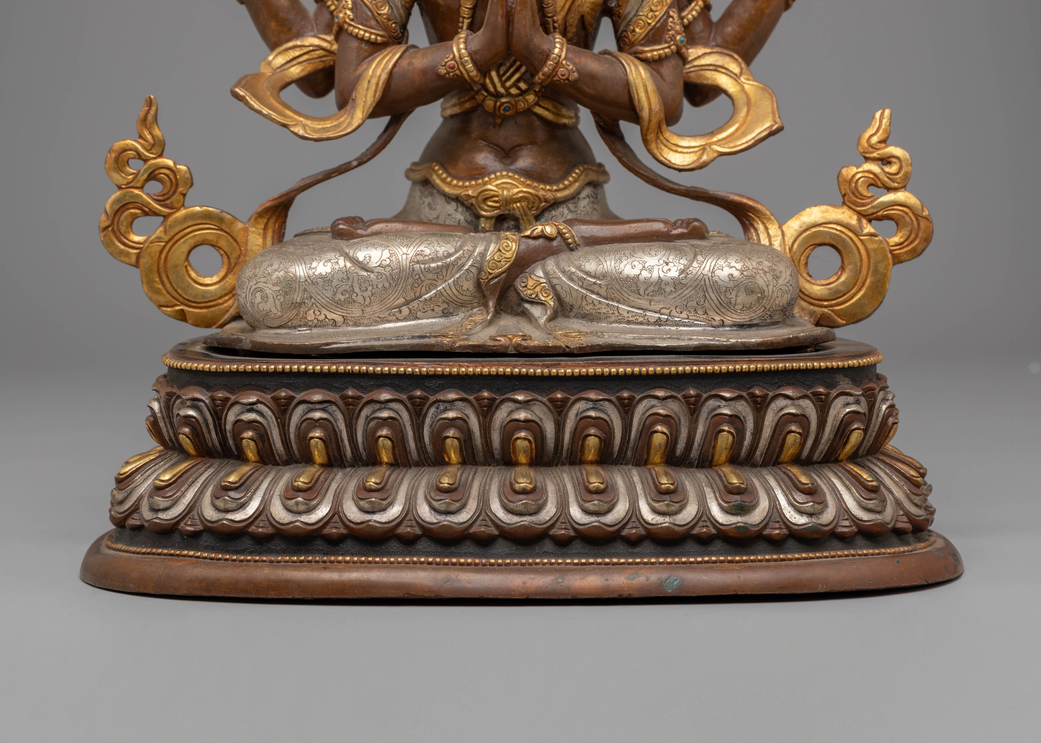 Handcrafted Copper Sculpture of Chenrezig with 24K Gold Gilding and Silver Plating