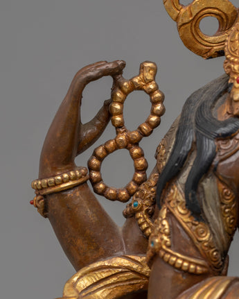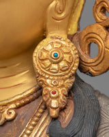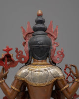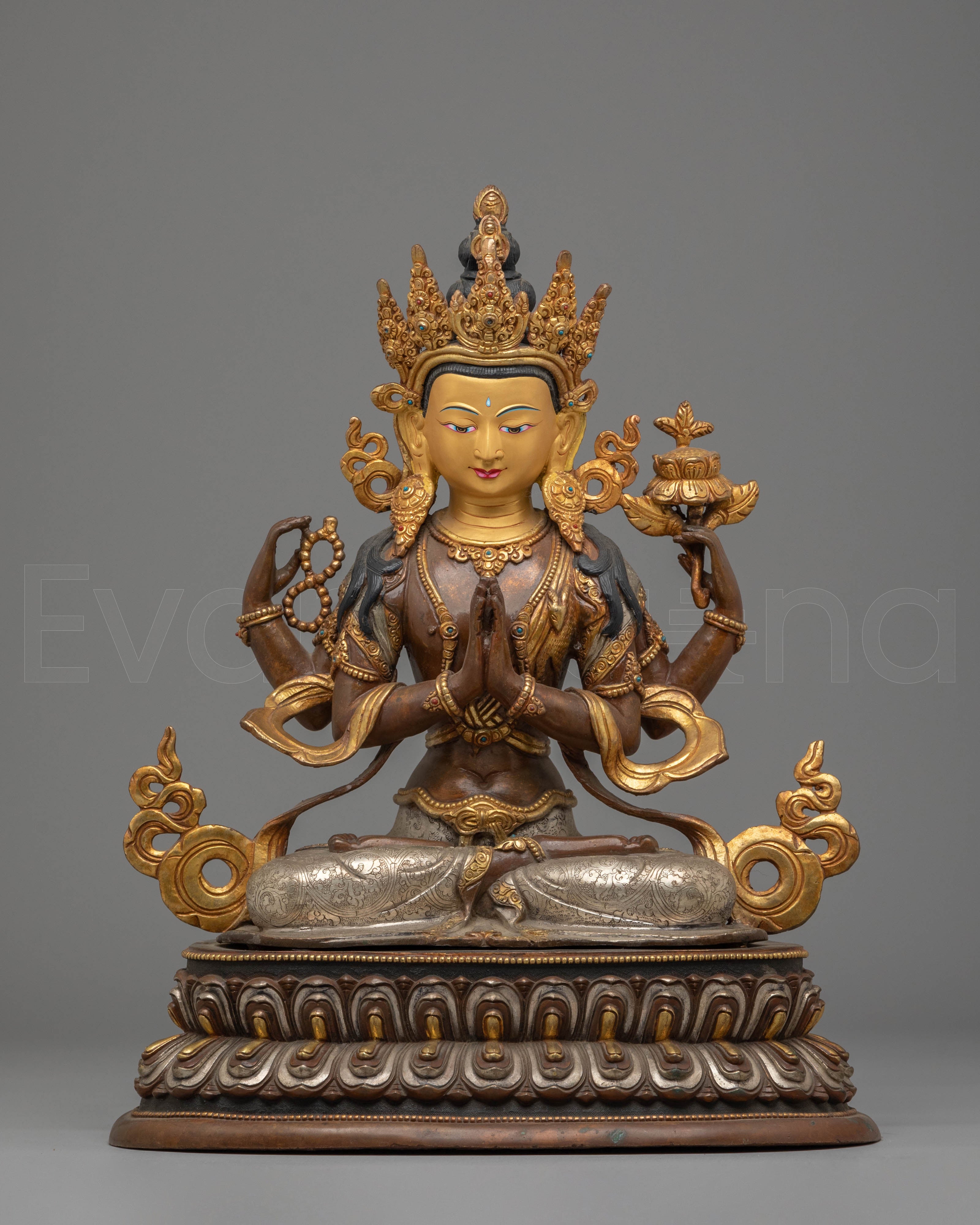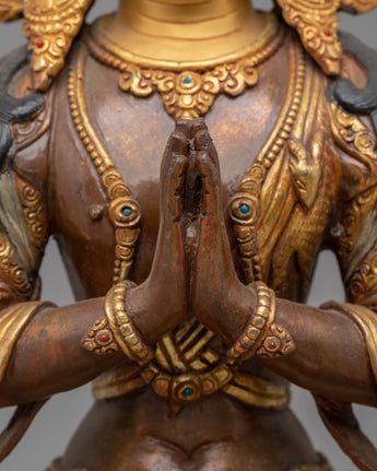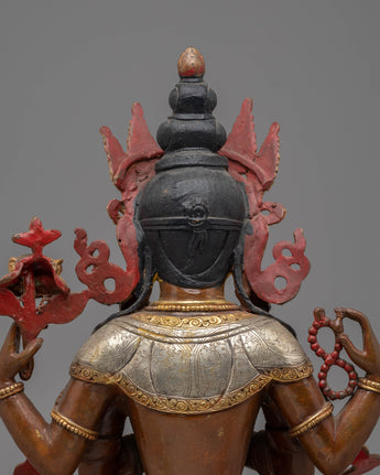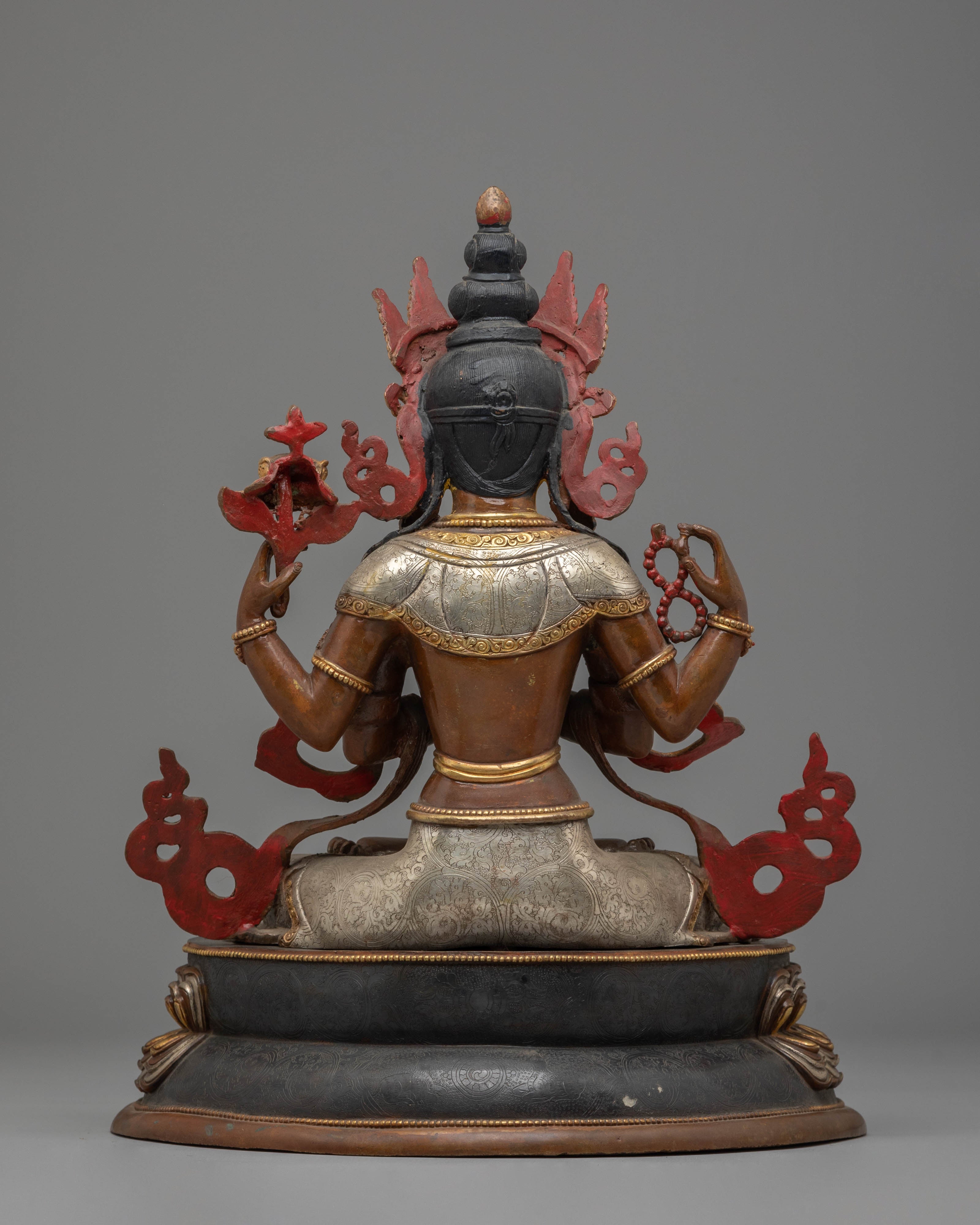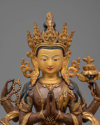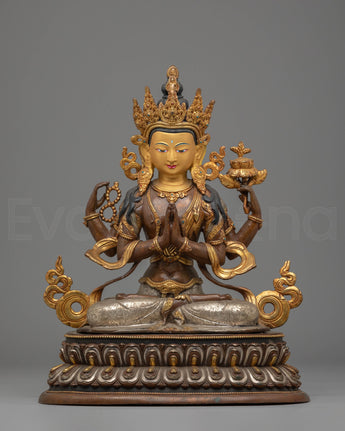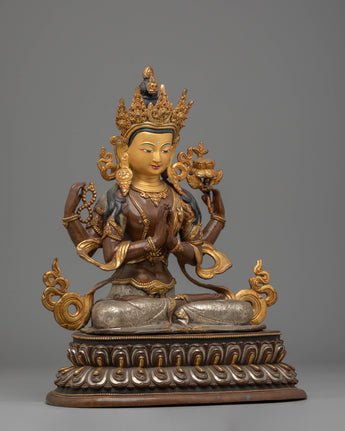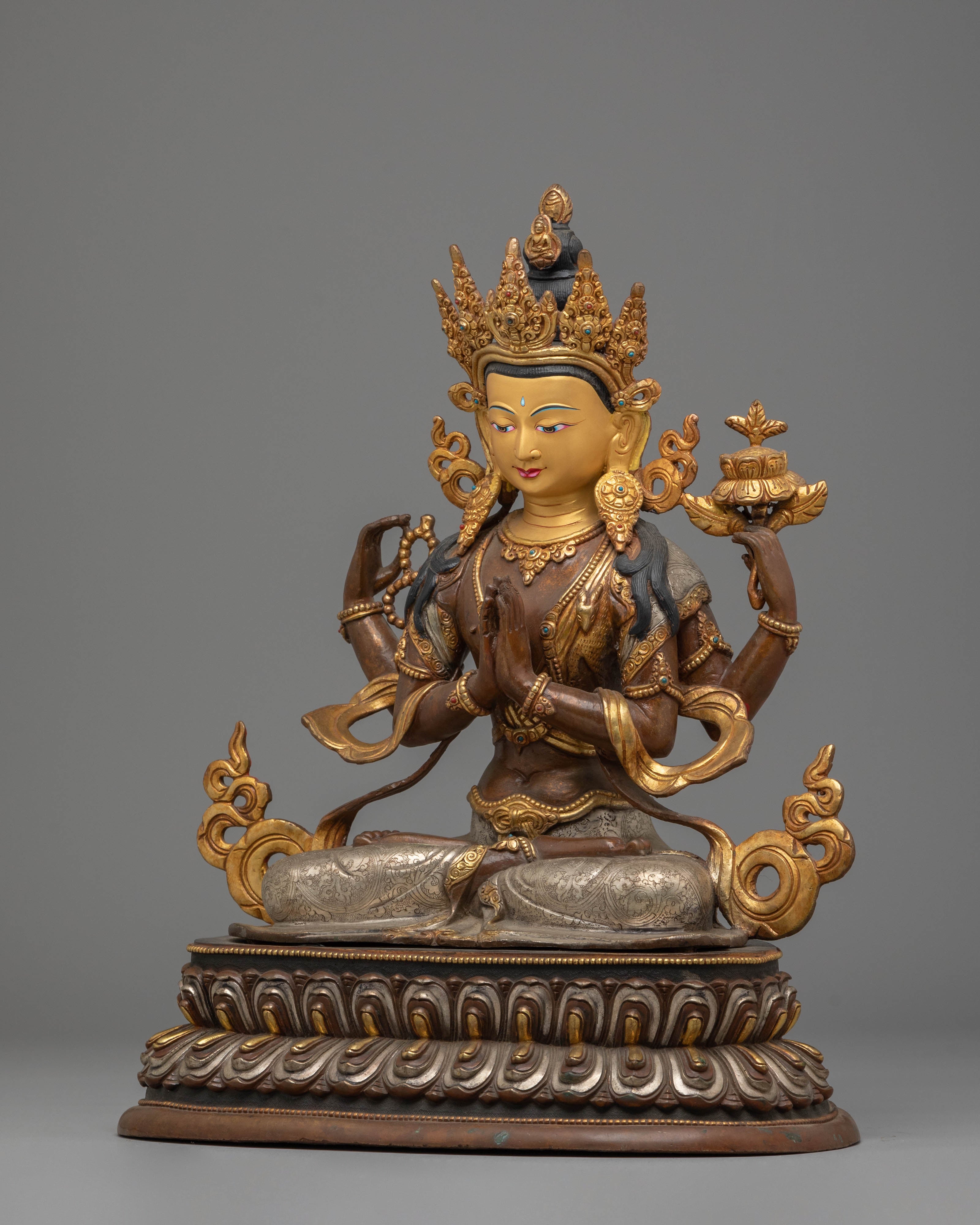 Handcrafted Copper Sculpture of Chenrezig with 24K Gold Gilding and Silver Plating