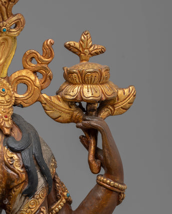 The Handcrafted Copper Sculpture of Chenrezig is a magnificent representation of Chenrezig, the Bodhisattva of Compassion. Standing at 38 cm in height and 29.5 cm in width, and weighing 7.13 kg, this sculpture is an extraordinary piece of art crafted from a copper body with 24K gold gilding, silver plating, and adorned with turquoise and coral artificial stones. The statue captures the boundless compassion and healing energy that Chenrezig symbolizes, making it a powerful addition to any spiritual space, meditation room, or altar.