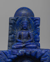 The lapis stone, revered for its rich color and healing properties, is skillfully shaped to depict Lokeshvara in a standing posture, a representation of his readiness to assist those in need. The intricate details carved into the lapis stone highlight Lokeshvara's compassionate expression and ornate attire. The presence of Amitabha Buddha at the top of the statue creates a sense of spiritual hierarchy.
