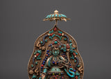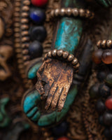 This Handcrafted Lokeshvara Bodhisattva Sculpture beautifully portrays the embodiment of boundless compassion in Mahayana and Vajrayana Buddhism. Also known as Avalokiteshvara, Lokeshvara is revered as the protector of all beings, responding to the cries of the world with kindness and aid. Standing 25.5cm tall, this gold-plated copper statue is adorned with vibrant lapis lazuli and turquoise stones, enhancing its spiritual beauty and symbolic significance.