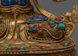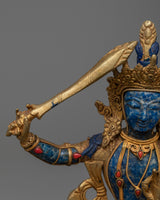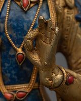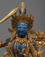 Introducing the Manjushri Bodhisattva Statue, a stunning representation of wisdom and enlightenment. Crafted from the exquisite lapis lazuli stone, this divine figure bears witness to Bodhisattva Manjushri's profound teachings. Enhanced with meticulous detail, the statue's accessories and base are made of copper and adorned with a radiant 24k gold plating, elevating its presence to celestial heights.
