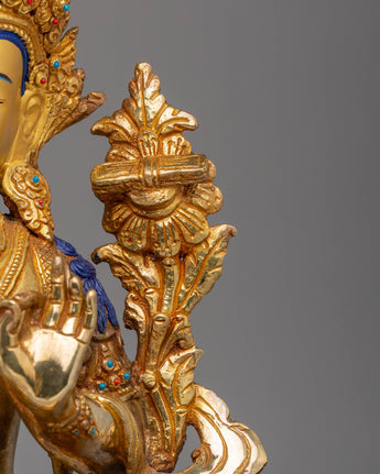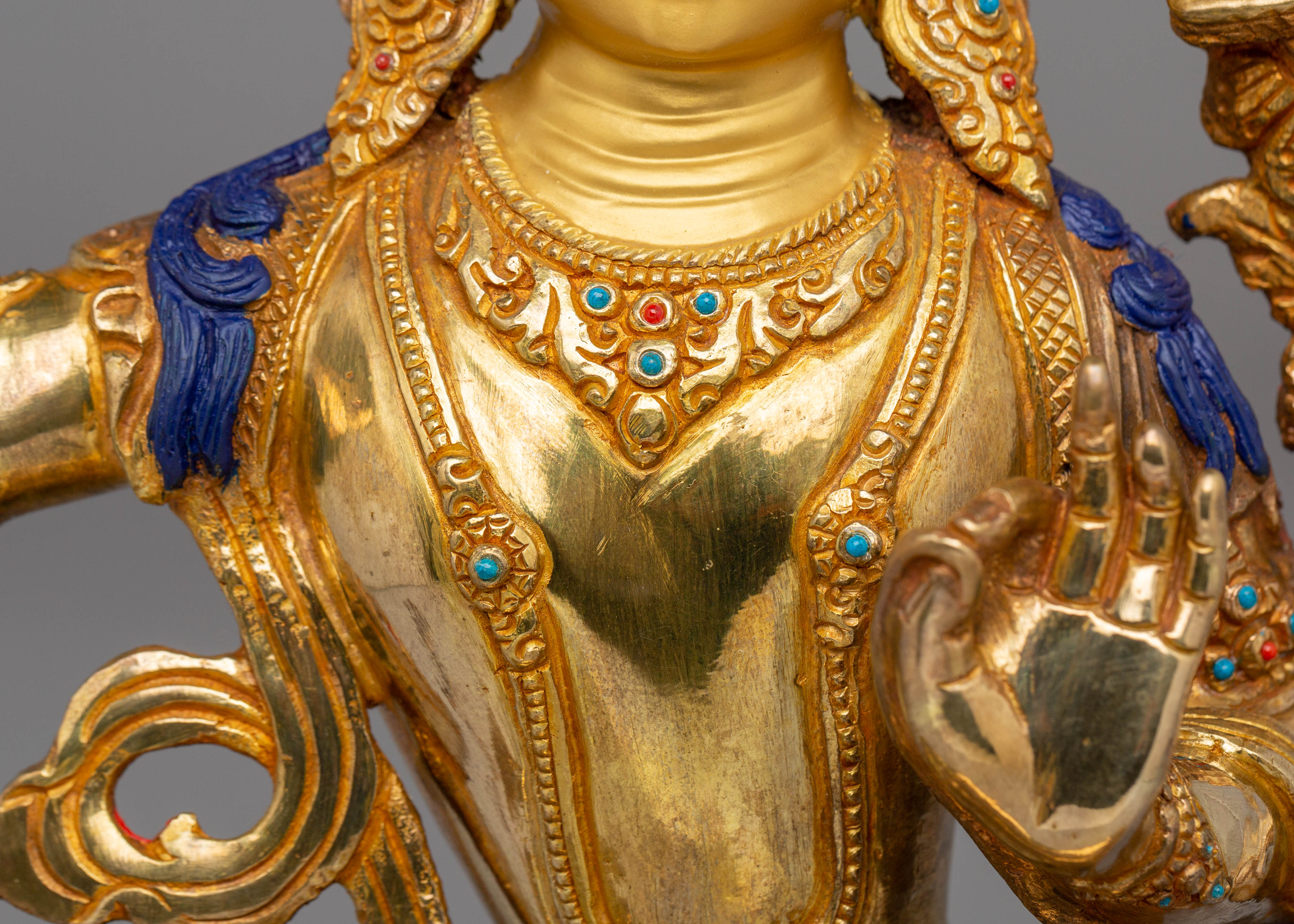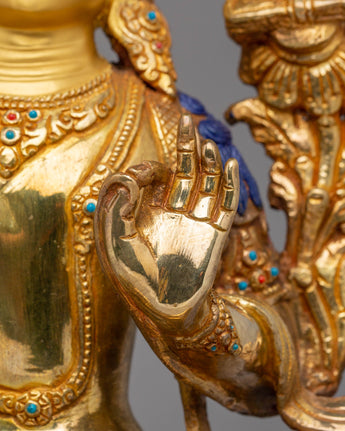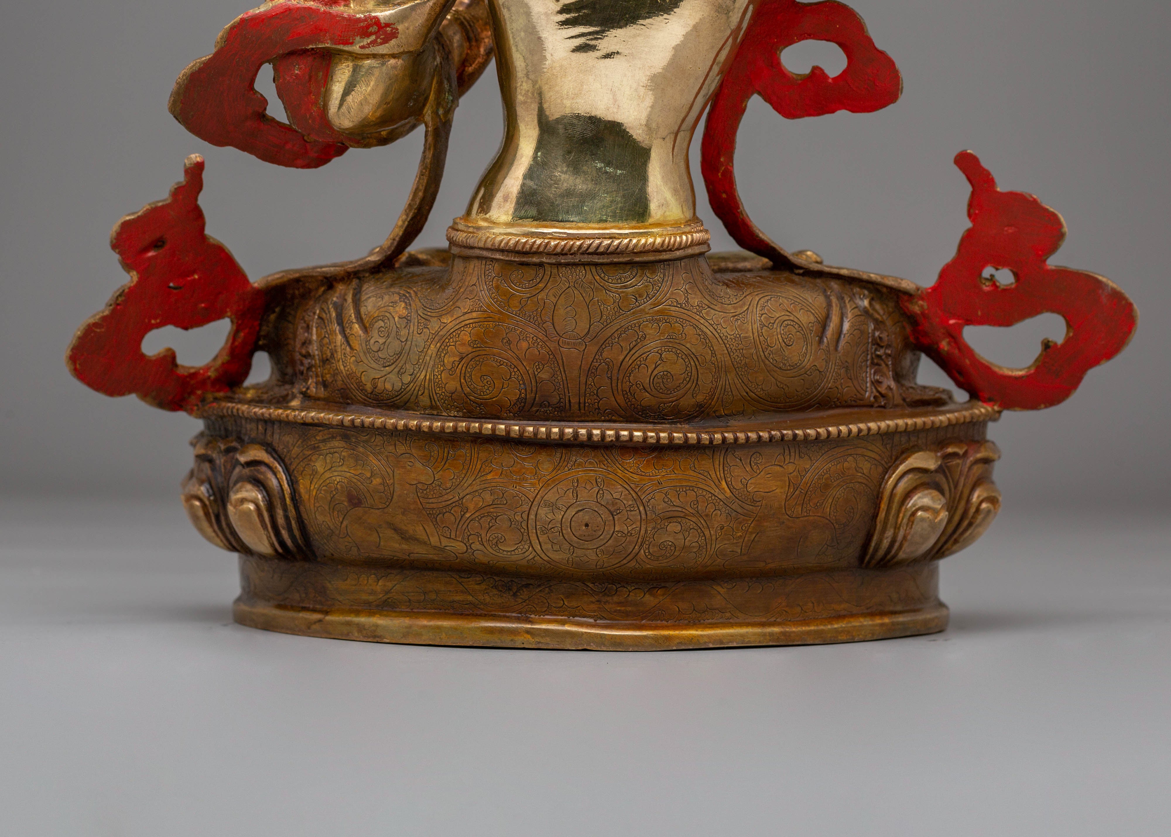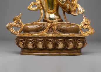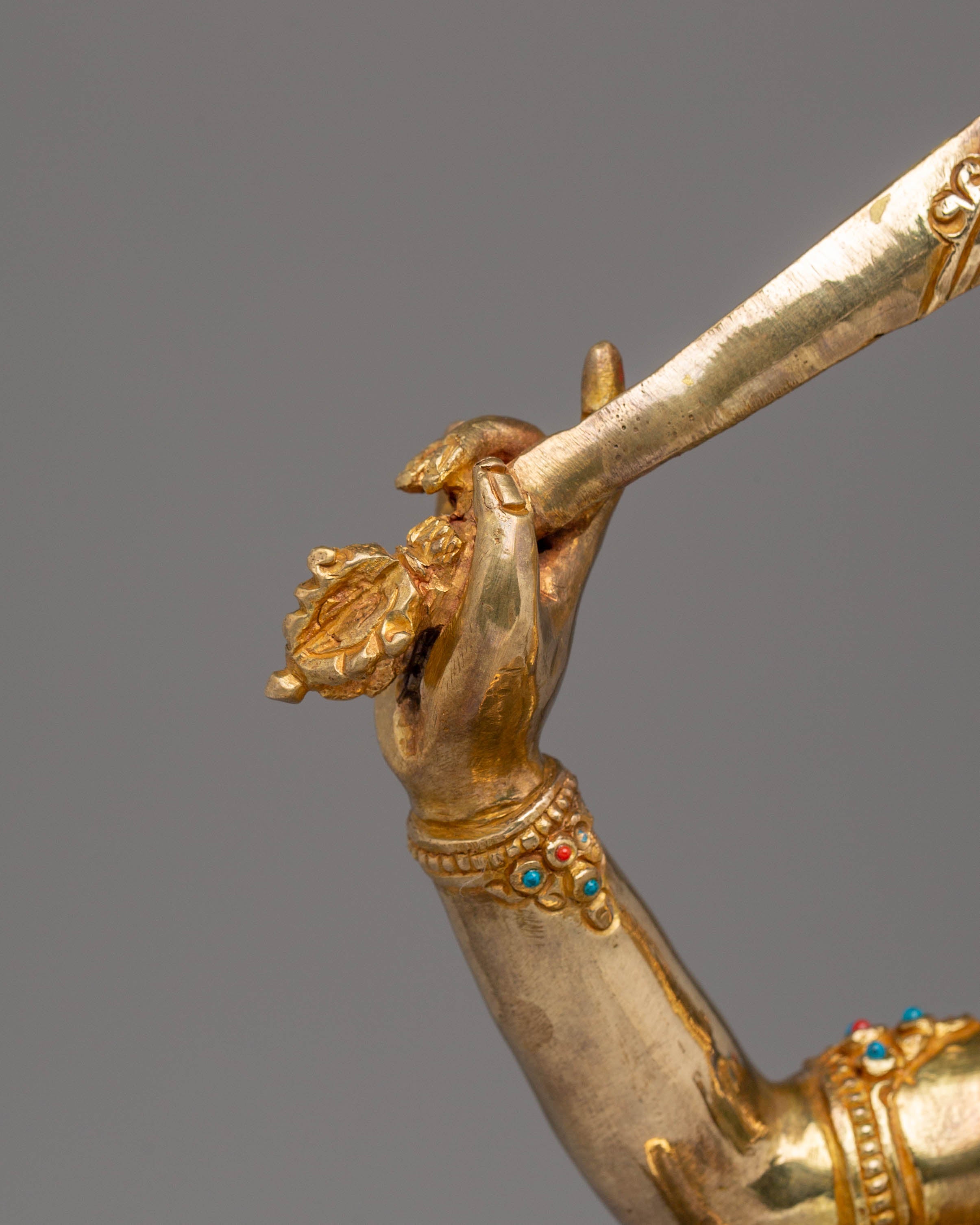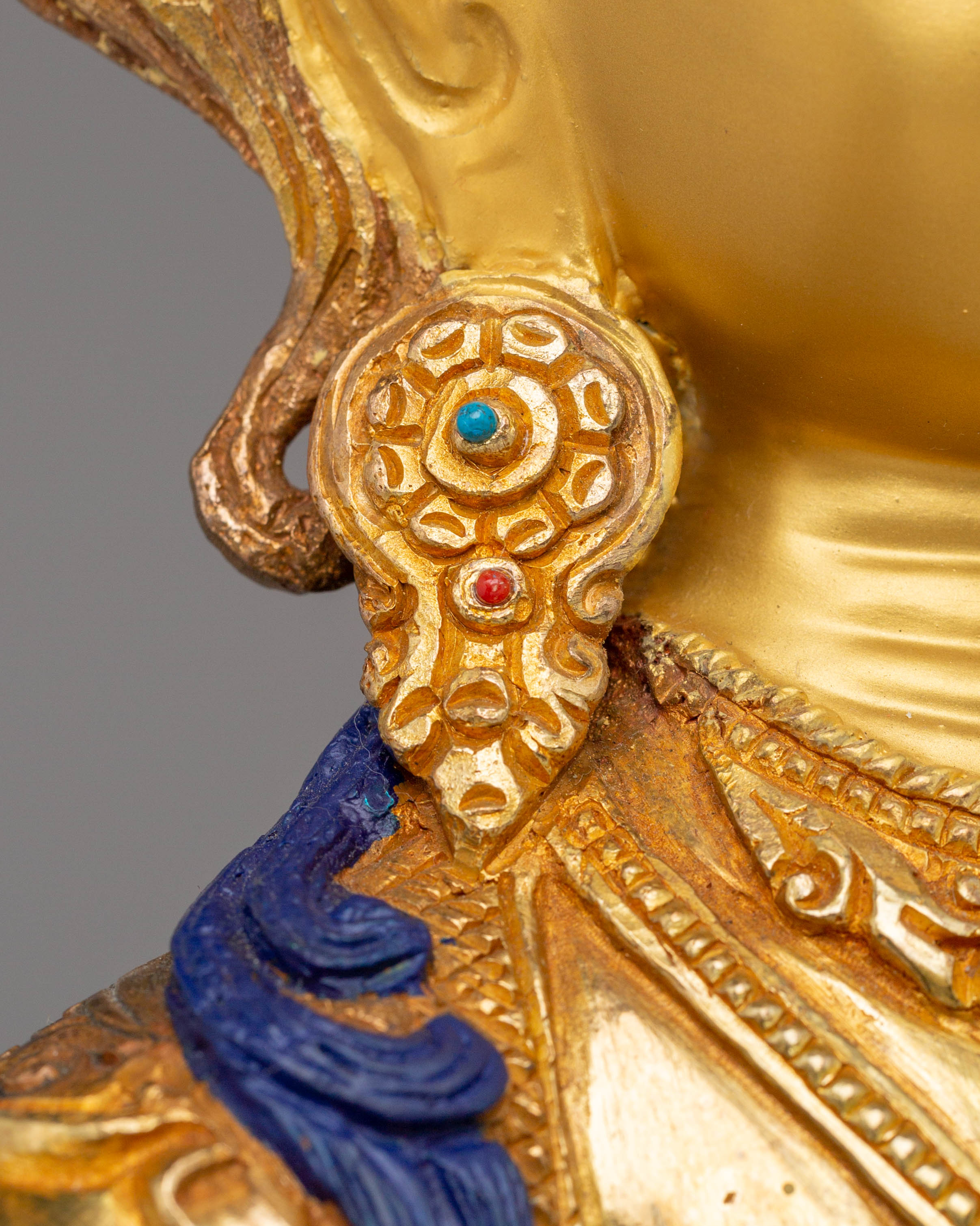 As the Bodhisattva of Wisdom, Manjushri is a powerful figure in both Mahayana and Vajrayana Buddhism. His wisdom is considered boundless, and his image serves as a guiding light for those on the path to enlightenment. This statue captures the deity’s regal and serene presence, with the 24K gold plating radiating a divine glow, while the gemstone accents add a touch of spiritual elegance. The handcrafted design is not only a work of art but also a potent spiritual tool for enhancing meditation, prayer, and rituals. Place this Manjushri Handmade Copper Statue in your meditation space or altar, and allow the wisdom and clarity of this sacred figure to inspire your practice.