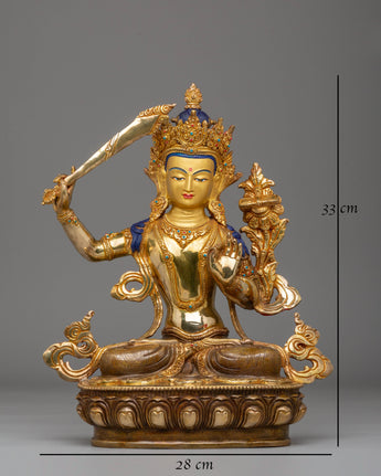 This stunning Manjushri Handmade Copper Statue is a beautiful representation of wisdom and clarity, meticulously crafted with 24K gold plating, acrylic colors, and a copper body. Standing at 33cm (Height) and 28cm (Width), and weighing 3.79 kg, it captures the essence of this revered Bodhisattva in exquisite detail. Known for his embodiment of wisdom, Manjushri is depicted holding a sword in his right hand, symbolizing his ability to cut through ignorance and illusion. His left hand holds a scripture, representing his teachings of knowledge. Each detail, from his serene expression to his ornate robes, is delicately hand-carved by skilled artisans, making this statue an exceptional addition to any altar or sacred space.