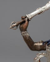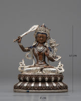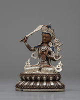 The Manjushri Prayer Tibetan Statue is a finely constructed machine-made sculpture with an electroplated silver finish on an oxidized copper body. This statue, adorned with exquisite workmanship and a beautiful design, personifies the compassion and wisdom attributed to Manjushri, the Bodhisattva of Wisdom.