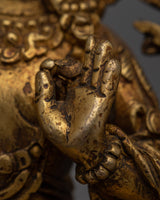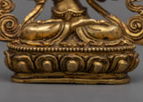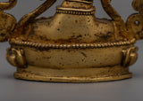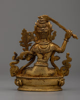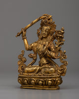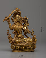 Elegantly handcrafted Manjushri Sadhana Statue in copper, enhanced with 24k gold plating, standing at 10cm in height and weighing 0.28kg.