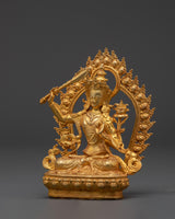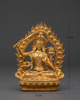 This beautifully made Manjushri Wisdom Bodhisattva Copper Statue commemorates the power of enlightened intelligence. This sacred figure, measuring 11 cm in height, 8 cm in width, and weighing 0.21 kg, is crafted of copper and beautifully plated in gold. Manjushri, the Bodhisattva of Transcendent Wisdom, is depicted wielding the sword of insight, which pierces ignorance, and clutching the Prajnaparamita sutra, which represents pure knowledge. Manjushri, a revered Mahayana deity, symbolizes mental clarity, eloquence, and spiritual awakening.