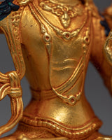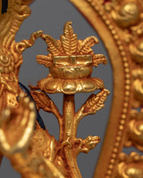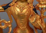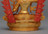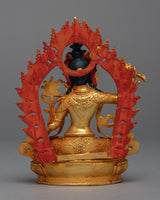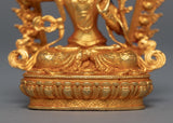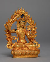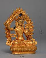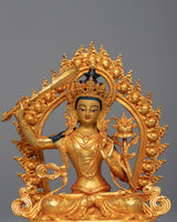 This Mini Manjushri Sculpture was crafted by machine with design patterns exclusively found in the valley of Kathmandu. The figure is molded from a copper body, gilded with 24k genuine and delicate hand painted with acrylic paint to highlight the carvings of the statue. The deity is seated upon a moon disc lotus as she holds a flaming sword above her head while making a mudra with her left hand. You can use this figurine for different Buddhist Rituals and meditational practices. The statue's small size makes it convenient to carry while engaging in frequent meditation practices.