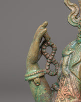 The design of the Chenrezig statue highlights the deity in a seated, meditative posture, radiating an aura of tranquility and boundless compassion. The oxidized copper body provides intricate details, from the serene expression of Chenrezig’s face to the delicate hand gestures symbolizing the blessings of compassion. The antique finish on the statue enhances its spiritual presence, giving it an ancient, timeless quality that embodies the essence of Chenrezig’s infinite love and wisdom. The figure of Chenrezig is depicted with multiple arms, each symbolizing the compassionate reach to help all beings.