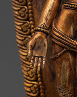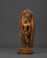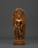 The Padmapani statue measures 27.5 cm in height and 11 cm in width, weighing 1.53 kg. This exquisite sculpture, crafted from gold-plated copper, depicts Padmapani, a revered Bodhisattva who embodies compassion and mercy in Buddhist traditions. Padmapani is depicted in a beautiful stance in the statue, representing tranquility and generosity. Its gold-plated copper body gives it a rich and dazzling appearance, making it a beautiful and spiritually uplifting addition to any home or meditation place.