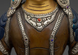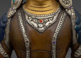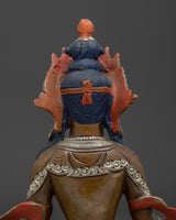 This gorgeous Sacred Amitayus Sculpture will provide longevity, energy, and profound inner serenity to your spiritual practice. This 9.3-inch sculpture, handcrafted in Nepal from oxidized copper, has exquisite gold and acrylic paints which highlight Amitayus' regal presence and forever peace.