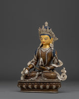 Amitayus sits elegantly on a lotus pedestal, holding the vase of immortality on his lap—a sign of limitless life energy and spiritual purity. His serene expression and exquisite crown represent the precise attention to detail of Himalayan workmanship, making this statue an effective complement to any healing altar, personal meditation nook, or spiritual shrine.