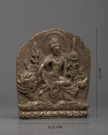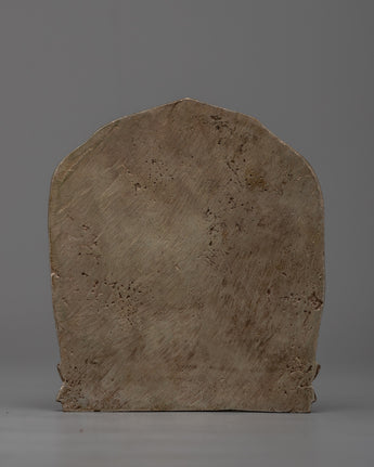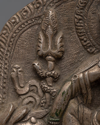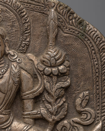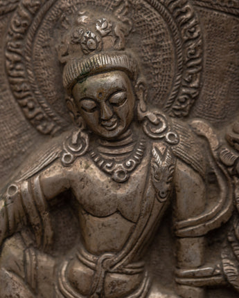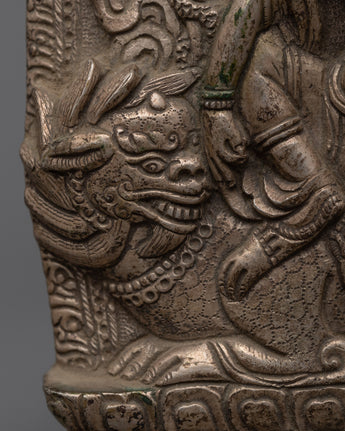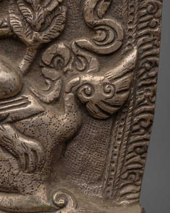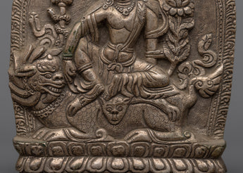 The Simhanada Avalokiteshvara Statue is meticulously handcrafted on a copper body, ensuring attention to detail and quality. The statue is then adorned with a layer of silver plating, which adds a lustrous and elegant touch to its appearance. After the silver plating, the statue undergoes an oxidation process, which intentionally darkens the surface to create an antique or aged effect. This oxidation enhances the intricate details and contours of the statue, giving it a sense of depth and character. The combination of copper, silver, and oxidation creates a captivating and unique Simhanada Avalokiteshvara Statue that embodies the essence of compassion and wisdom.