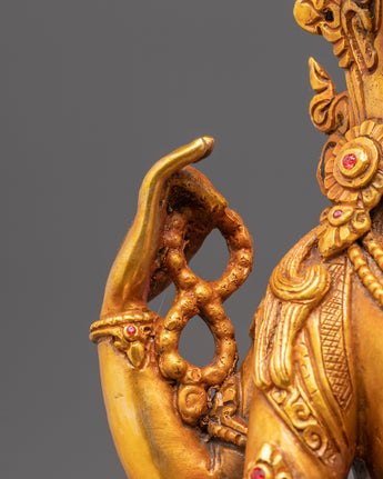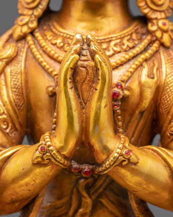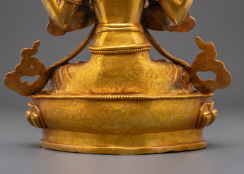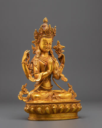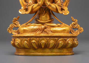 This Avalokiteshvara Bodhisattva statue is more than just a piece of art; it's a spiritual companion for people seeking peace, mindfulness, and spiritual development. This sculpture is ideal for yoga studios, temples, meditation spaces, or as a one-of-a-kind gift for Buddhist practitioners. It enriches any sacred environment while conserving the rich legacy of Tibetan Buddhist workmanship. Its gold-plated detailing and classic style make it a valuable collector's item as well as a spiritual focal point for home shrines. Keywords: Tibetan Chenrezig sculpture, Avalokiteshvara Bodhisattva statue, Tibetan spiritual art, handcrafted Buddhist sculpture, meditation altar décor, sacred Buddhist statue, copper gold-plated Buddhist art.