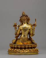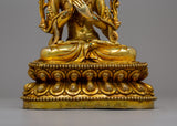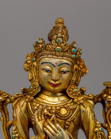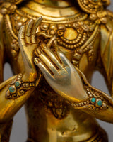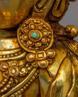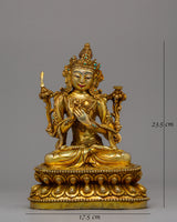 With this magnificent Tikshana Manjushri Statu, representing vivid intellect and spiritual enlightenment in the Buddhist tradition, you can honor the essence of knowledge and clarity. This statue's elegance and religious force are further enhanced by its original turquoise inlays and exquisite gold plating applied to its copper body. It is an eye-catching addition to meditation areas, Buddhist altars, or spiritual home décor, measuring 23.5 cm in height and 17.5 cm in width and weighing 2.27 kg.