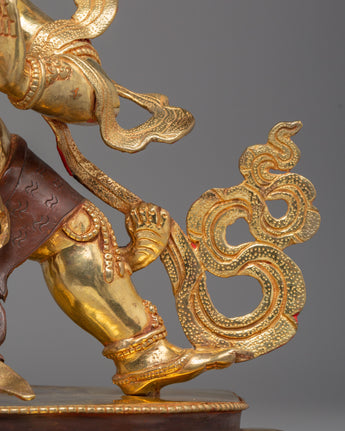 Vajrapani, also known as Chana Dorje in Tibetan, is a defender of the Buddha's tantric teachings, exemplifying the powerful energy that combats ignorance and obstacles. He is depicted standing with a wrathful expression, holding a vajra in his right hand and a lasso in the other, sculpted on a copper body and then gilded in genuine 24k gold.