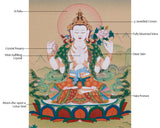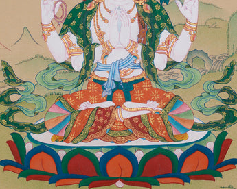 The Four-Armed Avalokiteshvara, Compassion Buddha, thangka is a beautifully hand-painted piece of art, carefully created on cotton canvas using vibrant acrylic colors and accented with 24K gold. The thangka is made in the traditional Karma Gadri style, a Tibetan Buddhist art tradition known for its intricate designs and vibrant colors. The gold emphasizes the figure's divine nature, while the vivid colors fill the image with sacred energy and life. The Karma Gadri style, known for its detailed layout and balanced palette, makes this piece an artistic and spiritual conduit, embodying the Compassion Buddha’s boundless love and wisdom.