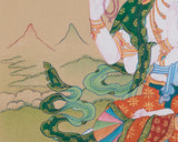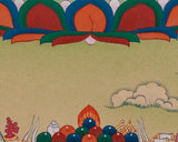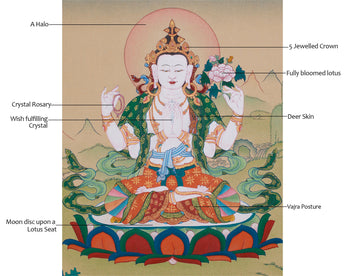 In this thangka, Chenrezig, also known as Avalokiteshvara, is depicted in his serene and compassionate form, embodying the essence of compassion. As a four-armed Bodhisattva, Chenrezig is shown holding a lotus flower in one hand and making a prayer gesture with the other. His calm, peaceful expression exudes profound wisdom and empathy. The vibrant lotus seat beneath him symbolizes purity and spiritual growth, while his regal attire and intricate golden crown reflect his elevated spiritual status. Surrounded by serene landscapes, this depiction of Chenrezig invites reflection on the qualities of compassion, kindness, and the protection of all sentient beings. The use of 24K gold accentuates the figure's divine presence, elevating the thangka as both a powerful spiritual symbol and a beautiful work of art.