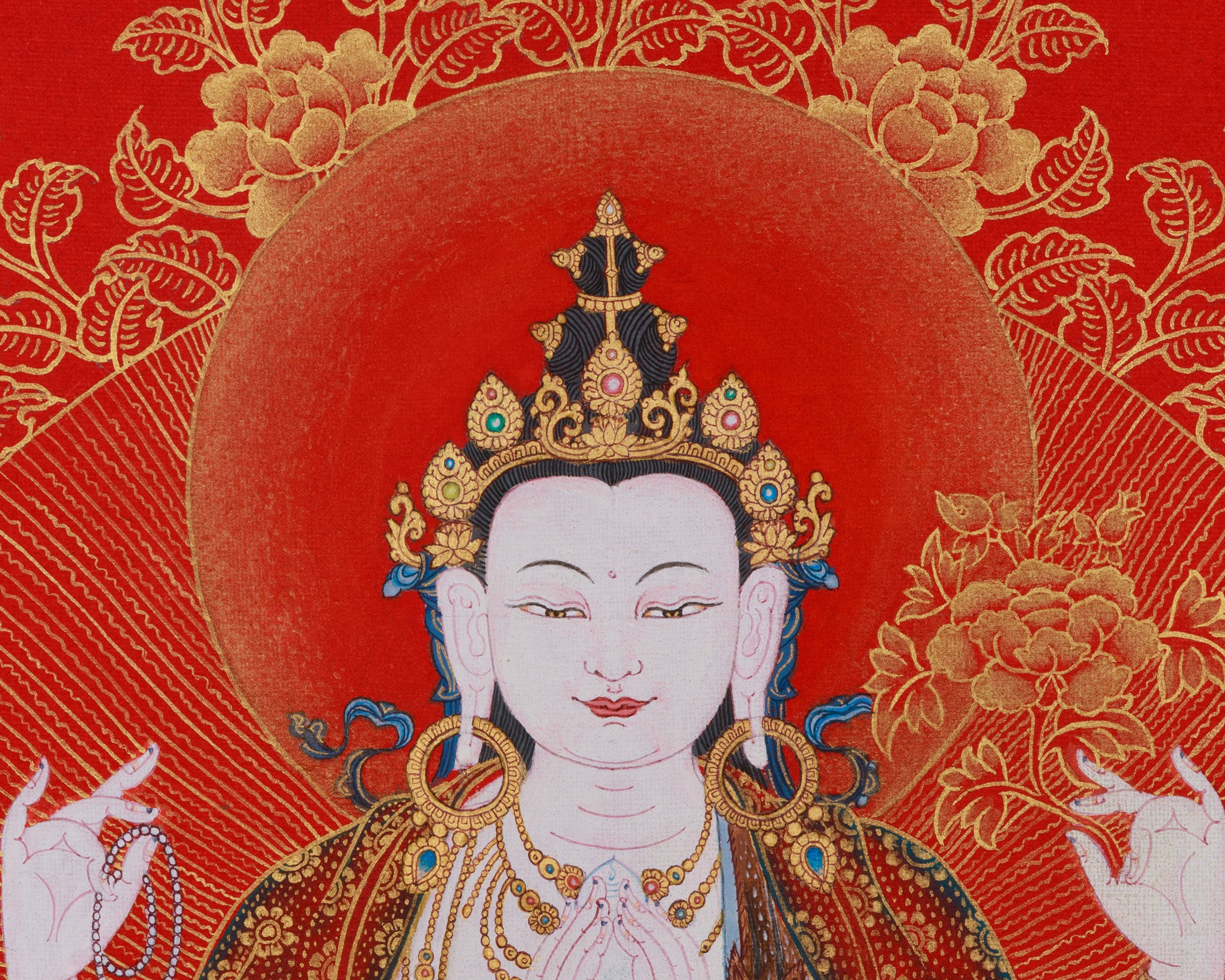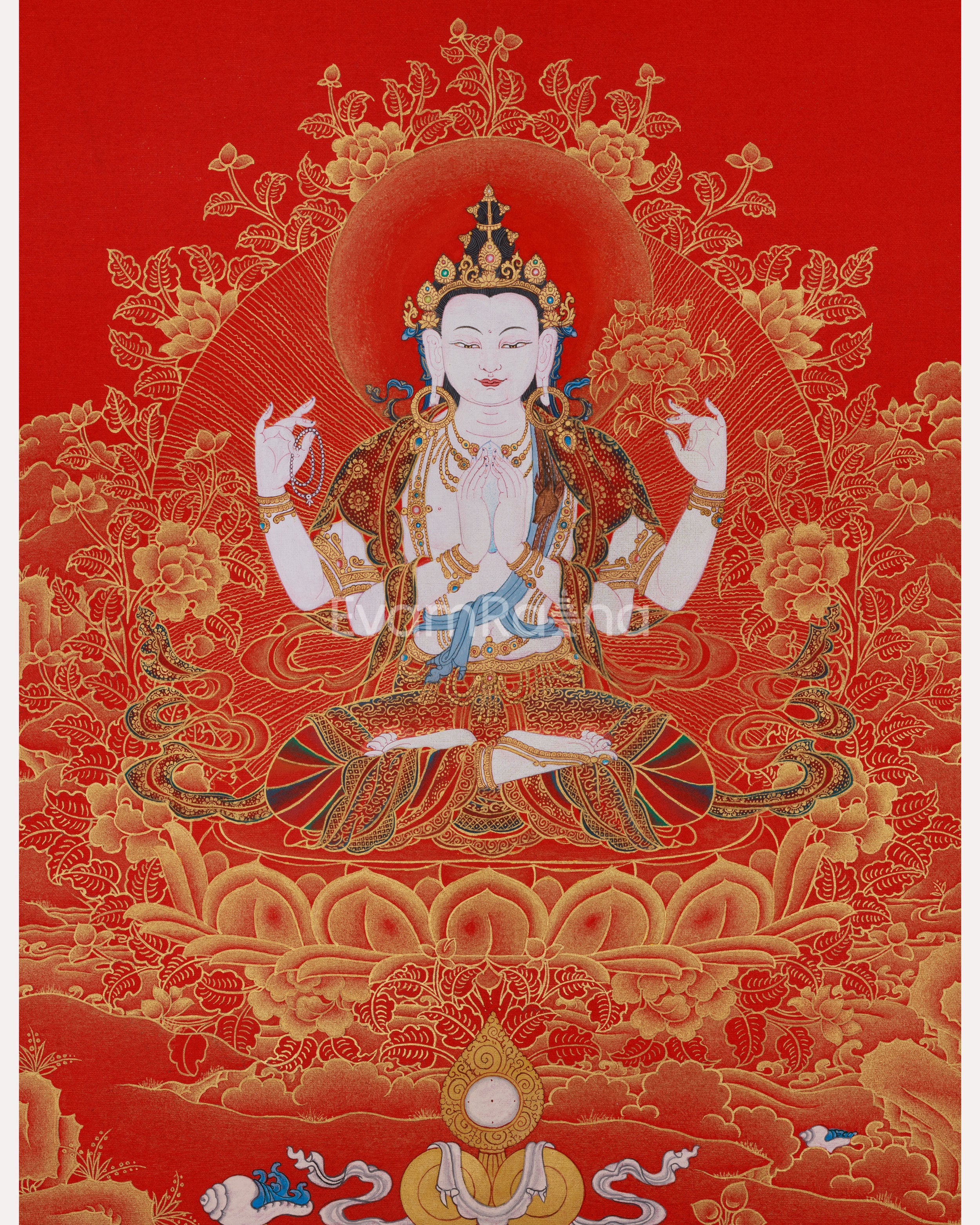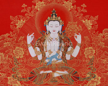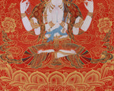 4 Arms Avalokiteshvara Thangka | Hand-Painted in Nakthang Style with 24K Gold on Red Canvas