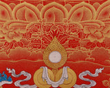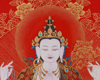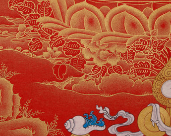 Nakthang, a sacred thangka technique from the Tibetan lineage, uses red to symbolize compassion and power, while gold is meticulously layered to form intricate patterns. The shimmering gold outlines lotus petals, floral scrolls, and divine garments with profound grace, illuminating the peaceful and powerful presence of Avalokiteshvara.