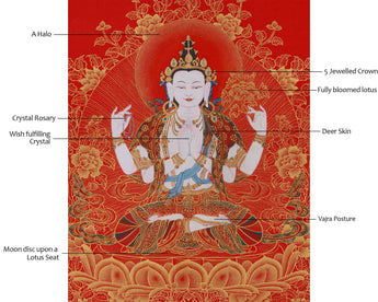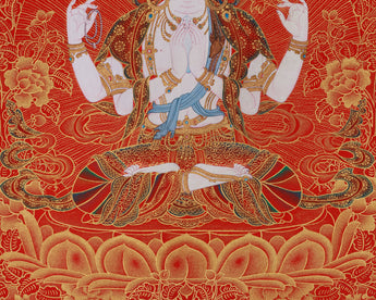 The 4 Arms Avalokiteshvara Thangka is a unique Nepali creation by Enlightenment Studio, meticulously hand-painted using acrylic colors and 24K gold. Following the Nakthang style, a unique Himalayan painting tradition where gold detailing is intricately worked over a deep red background.