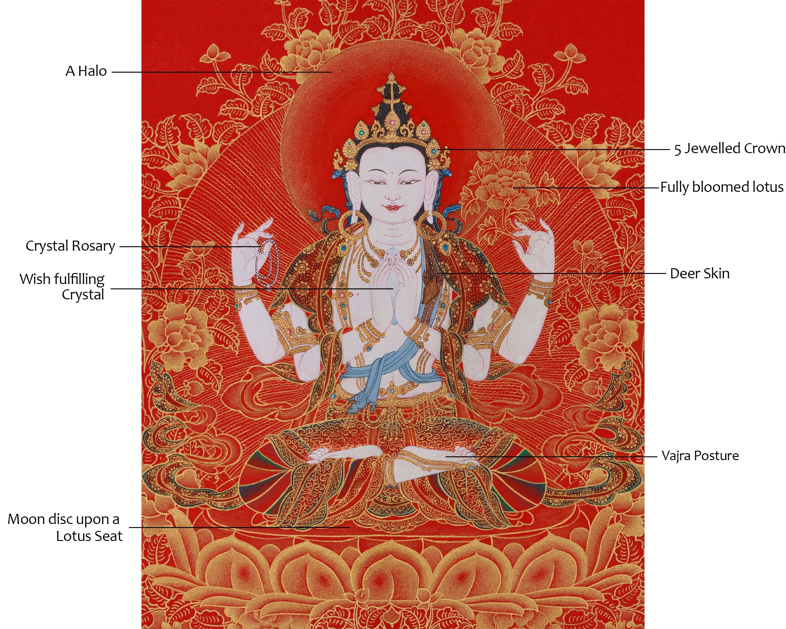 Avalokiteshvara, a four-armed Chenrezig, embodies the boundless compassion of all Buddhas. His two central hands are clasped in Anjali Mudra, holding a wish-fulfilling crystal, symbolizing pure intention. His right hand holds a crystal rosary, guiding beings to liberation through mantra recitation, while his left hand holds a fully bloomed lotus, representing the unfolding of wisdom and enlightenment.