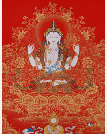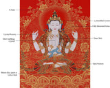 Golden Grace on Red, 4 Arms Avalokiteshvara Thangka, Deity of Compassion
