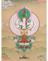 In this thangka, Chenrezig is beautifully depicted with his 1000 arms, each hand holding a different sacred object to symbolize his varied methods of compassion. His arms stretch outward in every direction, with eyes on each palm representing his ability to see and alleviate suffering wherever it exists.