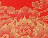 This thangka portrays Lord Ganesha, the deity associated with wisdom, prosperity, and new beginnings. Displayed in his luminous red form, he stands gracefully in a lively dance pose atop an eight-petalled lotus seat. He has multiple arms, each holding symbolic tools—axe, vajra, sword, hook, arrow, and spear—signifying his power to remove ignorance and lead devotees toward enlightenment. His calm yet commanding expression reflects a perfect balance—joyful compassion combined with strength. Ganesha’s large belly indicates his capacity to peacefully digest all life experiences—both good and bad—while his mongoose, shown below, expels jewels that symbolize boundless generosity. The golden backdrop, adorned with clouds and celestial motifs, elevates the divine beauty of this sacred piece, serving as a visual tribute to abundance, protection, and wisdom.