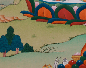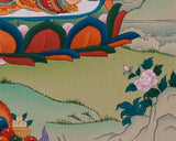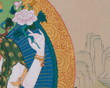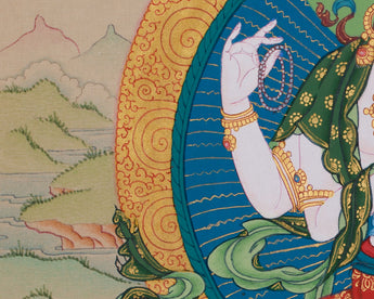 Chenrezig, also known as Avalokiteshvara, the Bodhisattva of Compassion, is venerated across all Buddhist traditions as the personification of infinite love and empathy. Renowned for perceiving the suffering of all beings and responding with limitless compassion, he is often depicted with four arms, holding a lotus and a beaded mala, symbols of purity and meditation. His serene and compassionate face, set against a backdrop of lush mountains and gentle clouds, enhances his healing presence in this thangka. The gold accents accentuate his divine form, making this artwork not just beautiful but also a powerful spiritual symbol that invites peace, healing, and compassion into your space.