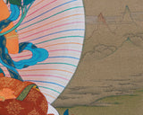 Manjushri, the Bodhisattva of wisdom, is highly respected in Mahayana Buddhism as a symbol of supreme knowledge and insight. Depicted with a sword representing the elimination of ignorance, he often appears with a calm, glowing expression, reflecting his profound understanding of reality's true nature. His teachings guide practitioners toward enlightenment, help overcome mental barriers, and foster greater wisdom. Manjushri’s presence encourages the clearing of the mind and the development of insight and compassion. This Thangka captures his serene yet powerful essence. Seated on a lotus throne and surrounded by divine light and symbols of wisdom, the details and gold accents enhance its sacredness, making it both beautiful and a tool for meditation and spiritual awakening. Bring it into your home and experience the uplifting, transformative energy of Manjushri.