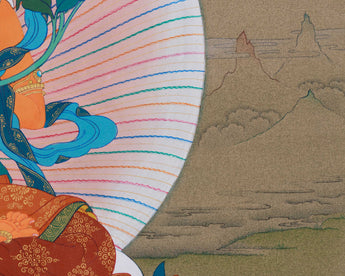 This Thangka of Manjushri Bodhisattva is a stunning example of spiritual craftsmanship, painted on high-quality cotton canvas using acrylic colors and decorated with genuine 24K gold. The use of 24K gold gives a divine glow to the piece, enhancing its sacred energy and emphasizing the detailed artwork. The traditional Karma Gadri style adds depth and richness, with each stroke reflecting the artist's reverence and dedication to their art. The vibrant yet peaceful colors of the Thangka create a meditative atmosphere, perfect for any space dedicated to spiritual practice or reflection.