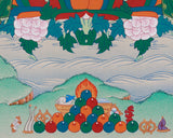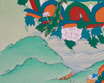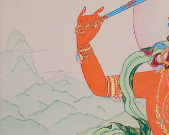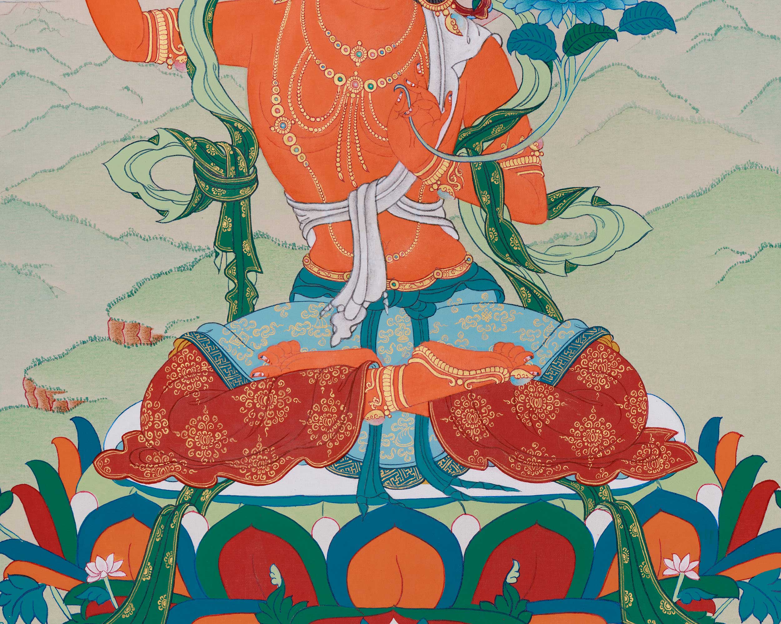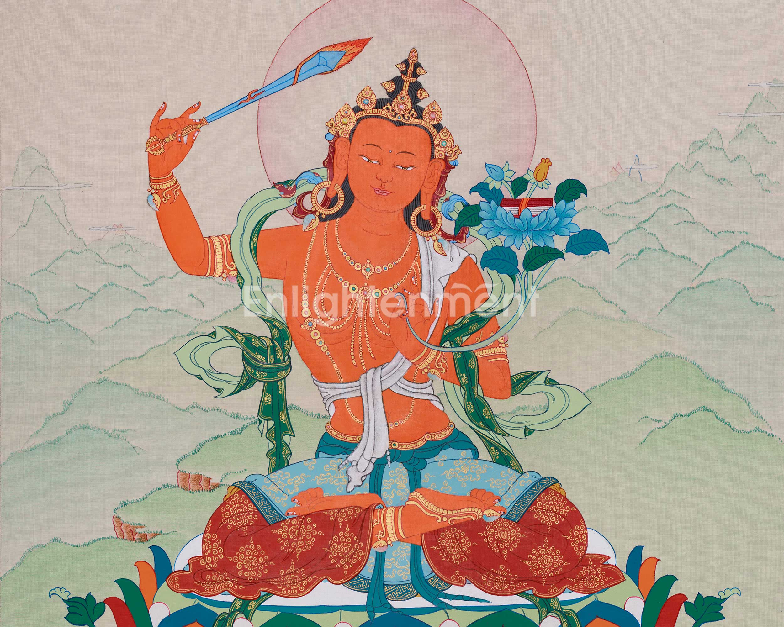 Manjushri, the Bodhisattva of Wisdom, is revered as a manifestation of transcendent knowledge and insight. In Buddhist teachings, he wields a fiery sword that cuts through ignorance, and he holds a lotus bearing the Prajnaparamita Sutra, symbolizing ultimate truth. His composed demeanor suggests that he is free of illusions, and his youthful appearance implies that an enlightened understanding remains ever fresh. In this thangka, Manjushri sits on a blooming lotus flower above a calm, green landscape. He gives off peace and wisdom. The delicate interplay of gold and orange hues amplifies his divine energy, while the soft mountain layers of the background evoke a tranquil, meditative realm. Place this thangka in your home or meditation space to inspire insight, mindfulness, and the luminous power of awakened knowledge.