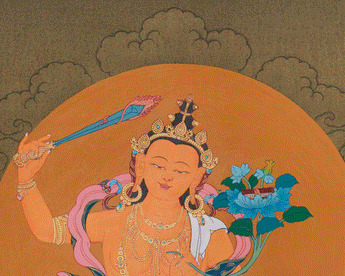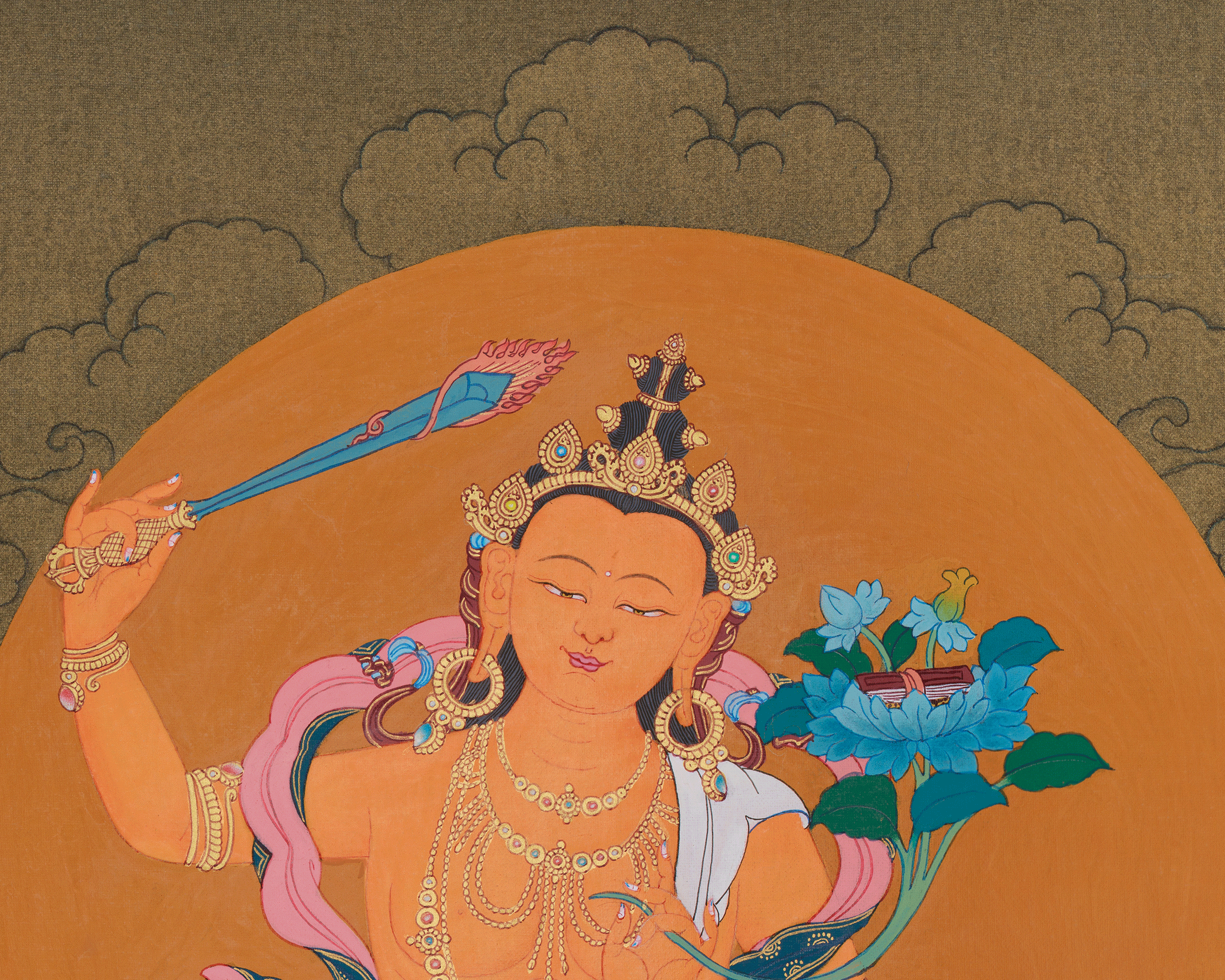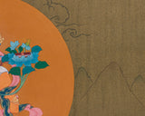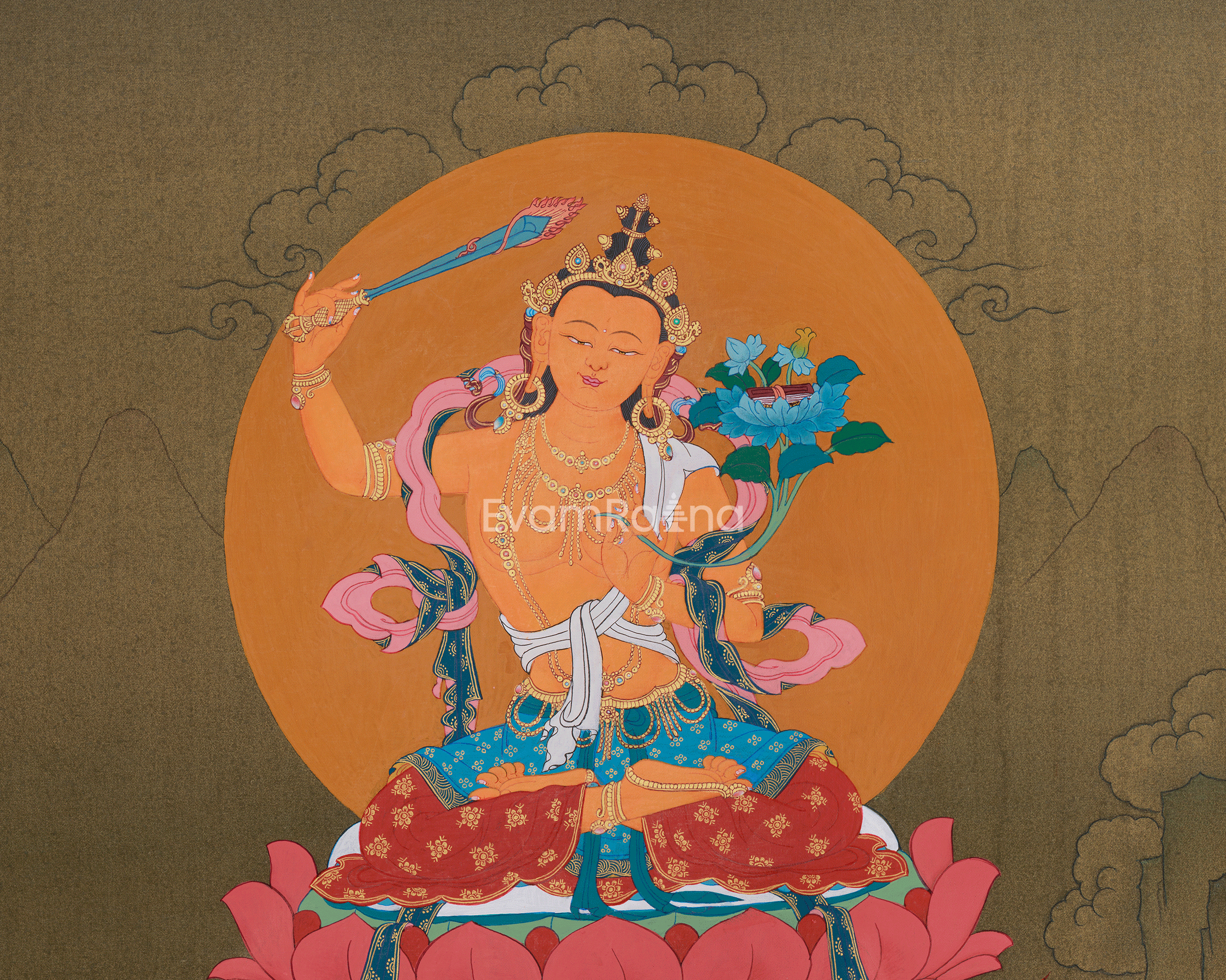 A thangka of Tibetan Buddhist Manjushri with Chenrezig and Vajrapani exemplifies the foundational principles of Mahayana Buddhism: wisdom, compassion, and power. It elegantly portrays these distinguished figures, encouraging practitioners to embody these virtues consistently in their daily lives and spiritual endeavors. The artwork serves as a medium for consciousness, effectively depicting the unity of divine attributes.