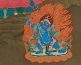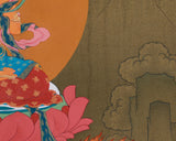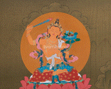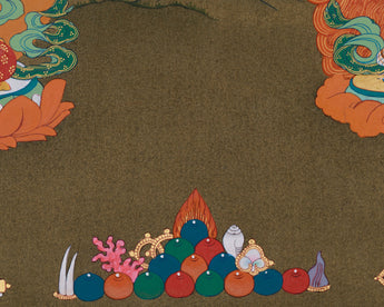In the center, Manjushri, the Bodhisattva of Wisdom, wields a fiery sword to cut through ignorance and holds a sacred scripture symbolizing knowledge. Chenrezig, the Bodhisattva of Compassion, sits with a wish-fulfilling jewel and a lotus, radiating kindness and love beyond boundaries. Vajrapani, holding a vajra, is depicted as the Bodhisattva of Power, symbolizing strength and determination in the face of challenges. Their calm expressions and detailed divine attributes make this thangka a meaningful addition to sacred collections and meditation spaces, fostering spiritual growth and connection.