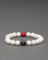 This Handmade White Beaded Bracelet is made out of polished 8mm beads strung together to form a lovely yet straightforward wrist item that can be worn for any occasion. The bracelet features a prominent red bead and a central black bead embellished with traditional symbols, offering a distinctive touch of cultural flair. Its adjustable design provides a comfortable fit for all wrist sizes, making it ideal for everyday use or gifting.