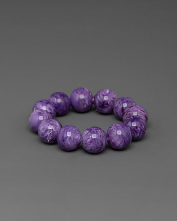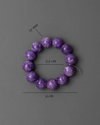 This Charoite Bracelet is crafted from genuine purple Charoite stones, a rare and powerful crystal known for its transformative energy. Each large 19mm bead displays mesmerizing violet and lavender swirls, making it not only a healing gemstone bracelet but also a striking accessory. Charoite is celebrated for its ability to cleanse negative energy, encourage deep transformation, and awaken spiritual insight.