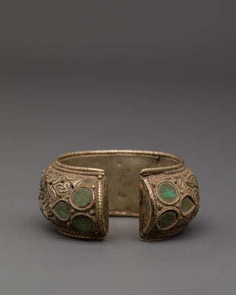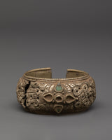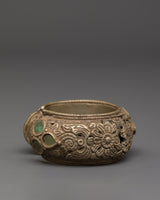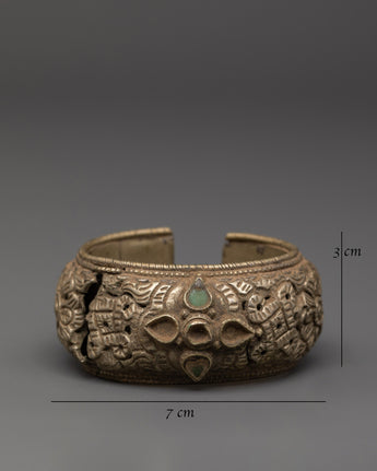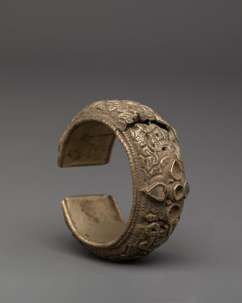 Crafted by skilled Himalayan artisans, the bracelet’s intricate carvings highlight centuries-old metalwork techniques and cultural symbolism. The silver plating enhances its luster while preserving the authenticity of the handcrafted design. Perfect for personal adornment or as a thoughtful gift, this bracelet serves as both a striking accessory and a meaningful cultural artifact.